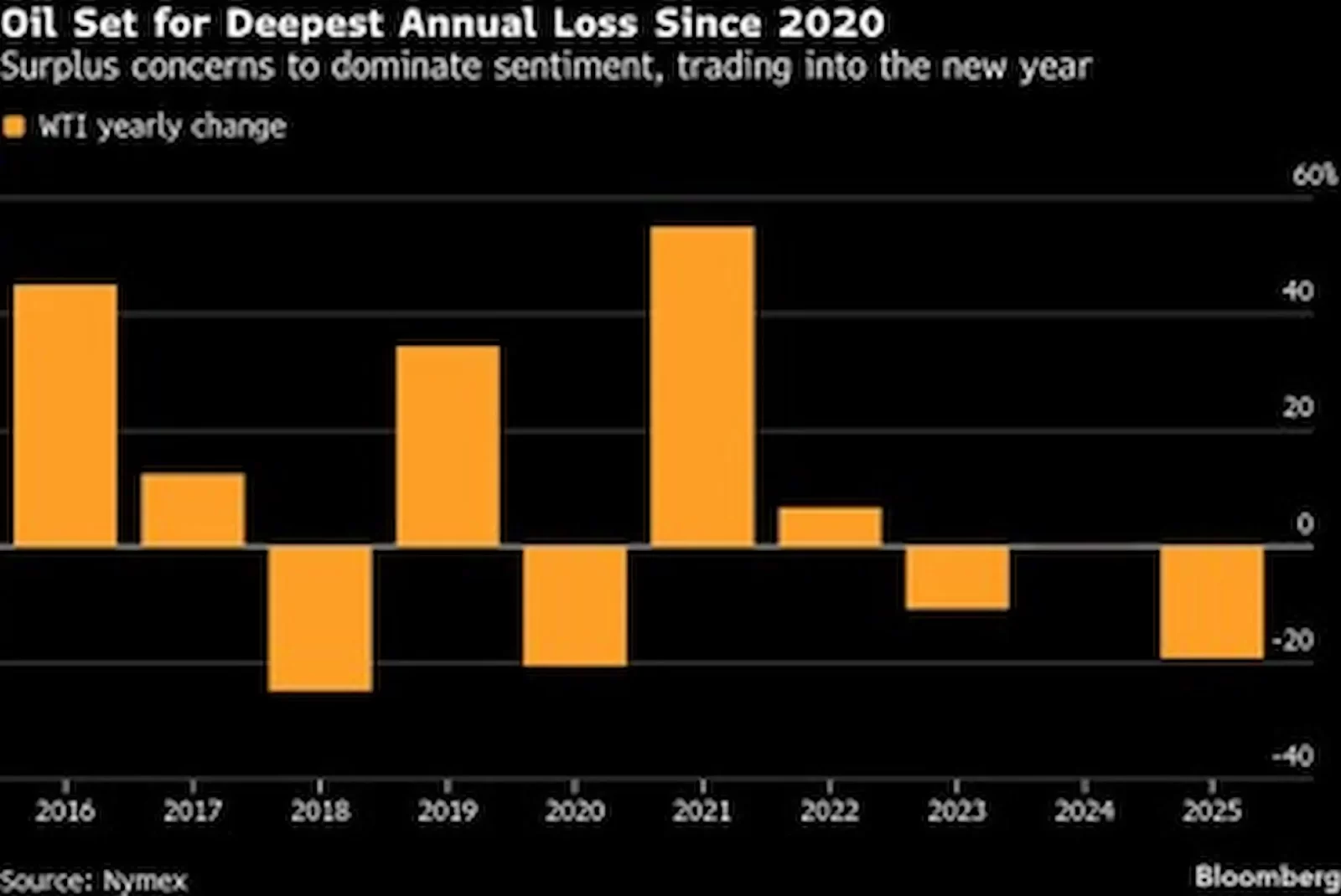 Oil posts deepest annual loss since 2020 on surplus concerns